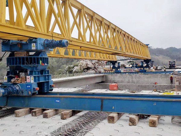 JQ900A型架橋機架梁作業為跨一孔簡支式架梁,由YL900型運梁車運梁至架橋機尾部喂梁,起重小車吊梁拖拉取梁,空中微調箱梁位置就位,架橋機采用液壓驅動輪胎走行,步履縱移過孔作業方