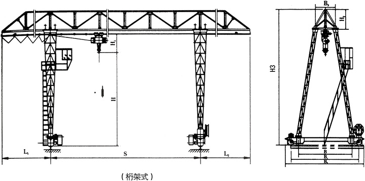 例:起重量:16t,跨度:16.5m,左右懸臂3/3m,起升高度6m,工作級別A3,開式操縱室操縱 表示方法:MH1616.5(3/3)6KSA3