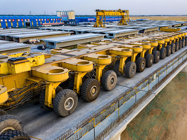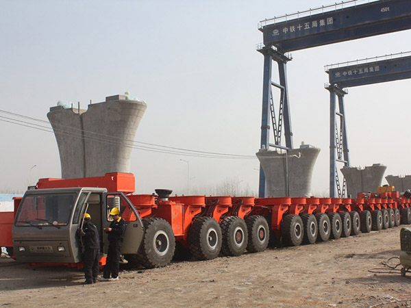 運梁平車,將在預制廠或橋梁現場預制的鋼筋混凝土梁橋橋面板運送到架橋機的專用車輛。分軌行式和輪胎式等。主要由幾十個驅動輪與從動輪、車架、駕駛室、操縱控制系統、輔助裝置等組成。由于載重大(達千噸),故要求高度低,以降低架橋機總體高度。是架橋機施工的配套設備。