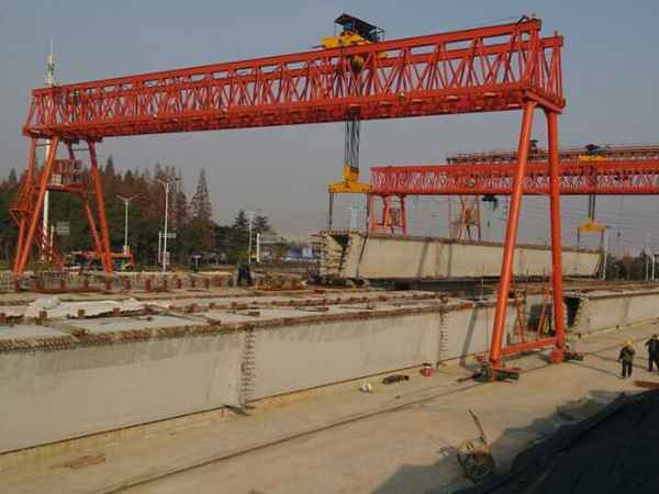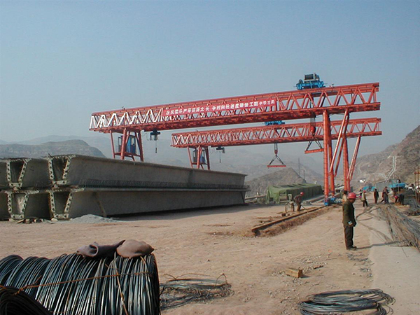 該設備既可兩臺配合抬吊預制梁,也可以單臺起重機配雙吊具起吊預制梁,兩臺同時起重的提梁機各自的起重量一般為450噸,單臺起重的提梁機起重量通??蛇_900噸。它配置支腿行走、天車行走及天車起吊設備,可以實現全方位機械化動作。主要用于將預制梁從制梁臺提吊至存梁臺位,預制梁養護完成后將其從存梁臺位吊運到運梁車上。作為起重設備完成架橋機的組裝和拆卸。還用于架設墩身不高的旱橋。